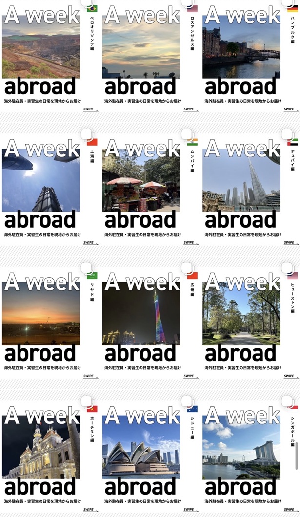 Instagram上で公開している企画の紹介です。世界中に駐在し、活躍している伊藤忠商事の先輩社員の業務やプライべ―トのリアルをお届けする企画です。就活生の皆様へのメッセージも記載しておりますので、ぜひご覧ください。